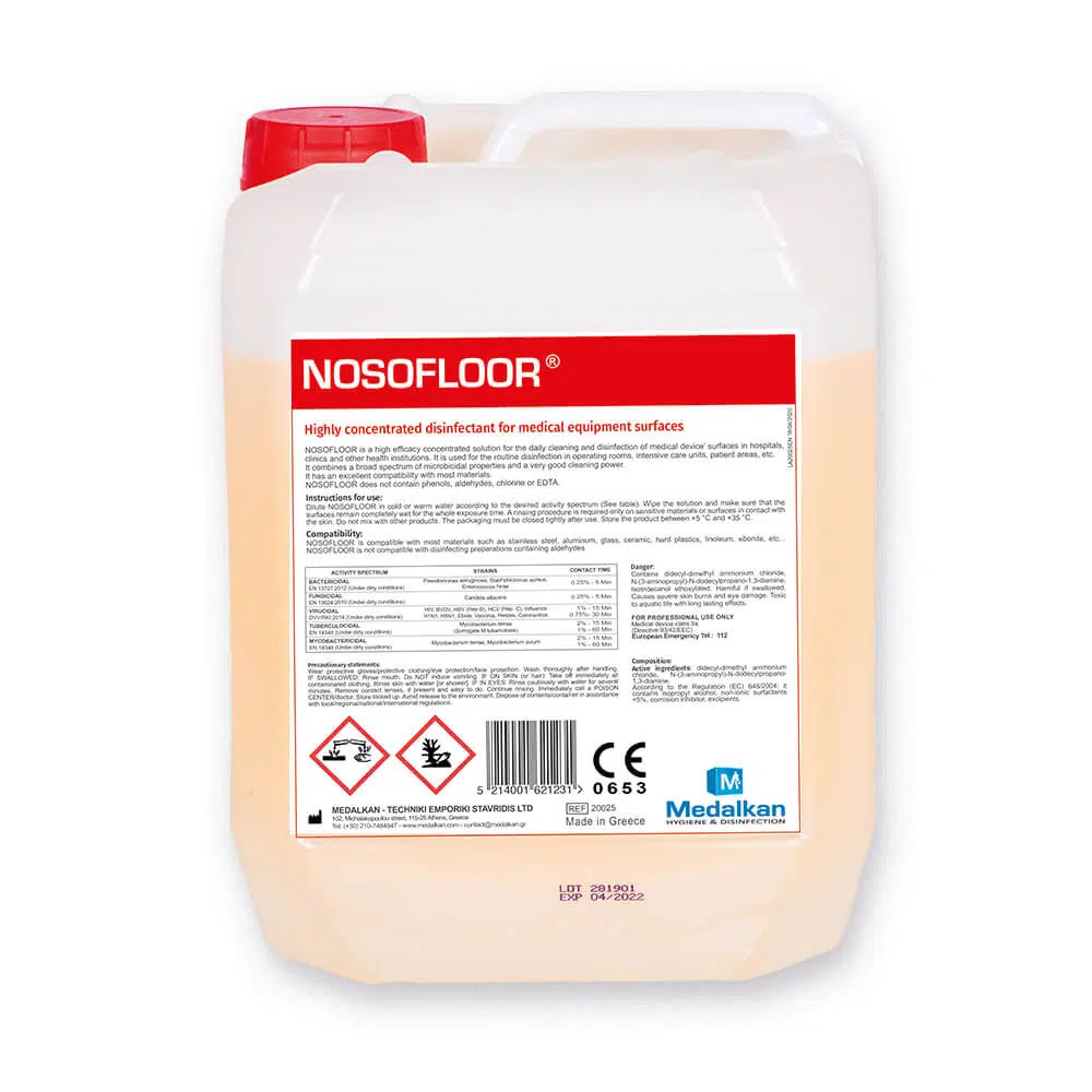 NOSOFLOOR est un détergent désinfectant de surfaces ultraconcentré associant un large spectre d’activité antimicrobien à un excellent pouvoir nettoyant. Il est destiné au nettoyage et à la désinfection de tous types de surfaces de l’équipement médical.