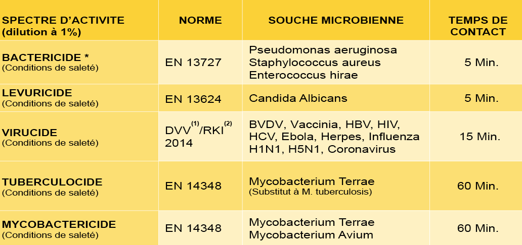 - Virucide (VHB, VIH, VHC, Herpès, Vaccinia, BVDV, grippe, Εbola, Coronavirus, etc)
