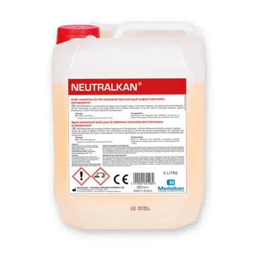 NEUTRALKAN est un composé d’acides organiques et inorganiques très concentré. Il élimine efficacement les résidus alcalins, calcaire, taches de rouille et dépôts minéraux des instruments et des parois internes des laveurs automatiques.