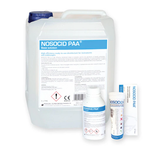 NOSOCID PAA est un désinfectant de haut niveau spécialement formulé pour la stérilisation à froid des instruments thermosensibles et des endoscopes. Il est basé sur une synergie d’acide peracétique et de peroxyde d’hydrogène.